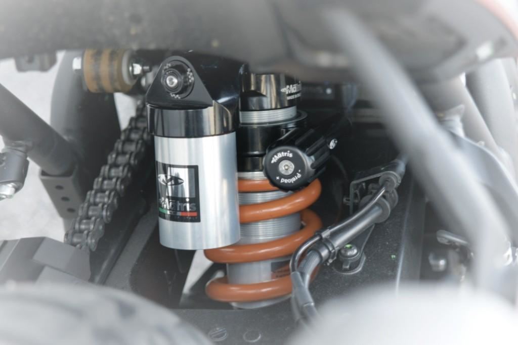 Αμορτισέρ Monoshock με διπλή ρύθμιση και ξεχωριστό δοχείο αζώτου. Ο κύλινδρος του αμορτισέρ είναι κατασκευασμένος από κράμα αλουμινίου Al 7075 και το έμβολο (Φ 16mm) από κράμα ατσαλιού υψηλής αντοχής με επίστρωση χρωμίου. Οι διαθέσιμες ρυθμίσεις του είναι: • Απόσβεση Επαναφοράς • Απόσβεση Συμπίεσης • Προφόρτιση με γαντζόκλειδο • Ύψος. Το ελατήριο του αμορτισέρ είναι κατασκευασμένο από κράμα χρωμιο-μολυβδαινιούχου ατσαλιού. Η παραγγελία του αμορτισέρ γίνεται πάντα ανάλογα με τα κιλά του αναβάτη, ώστε να επιλεγεί το κατάλληλο ελατήριο.